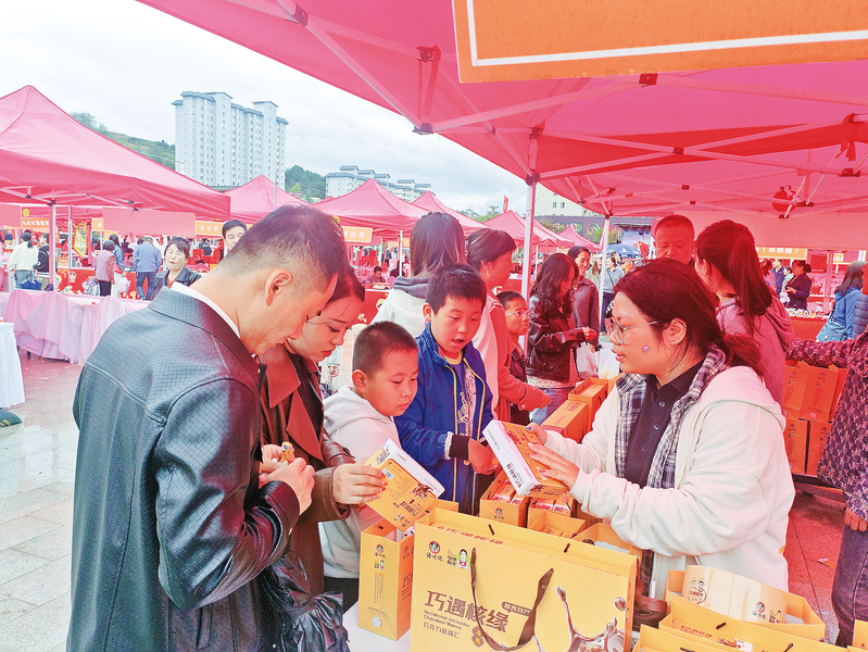 国庆期间,洛南县举办了2025年洛南豆腐·洛南核桃促消费促增收活动,在惠民广场设置了120个农特产品销售摊位,在花溪路设置了80个特色美食摊位,让市民和游客在节假日逛得舒心、吃得开心、买得放心。图为10月3日惠民广场摊位前,游客正在购买核桃加工产品。 (本报记者 张雯靓 摄)