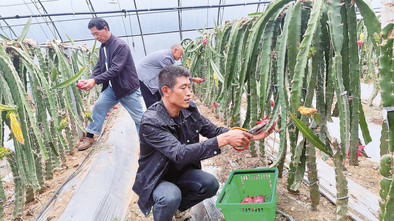 10月7日,丹凤县棣花镇万湾社区产业大棚里,务工人员在采摘火龙果。该社区发展集体经济建起28个大棚,种植圣女果、草莓、火龙果、葡萄和食用菌等,解决了社区20多人在家门口就业,人均年收入2万元以上。 (本报记者 贾书章 摄)