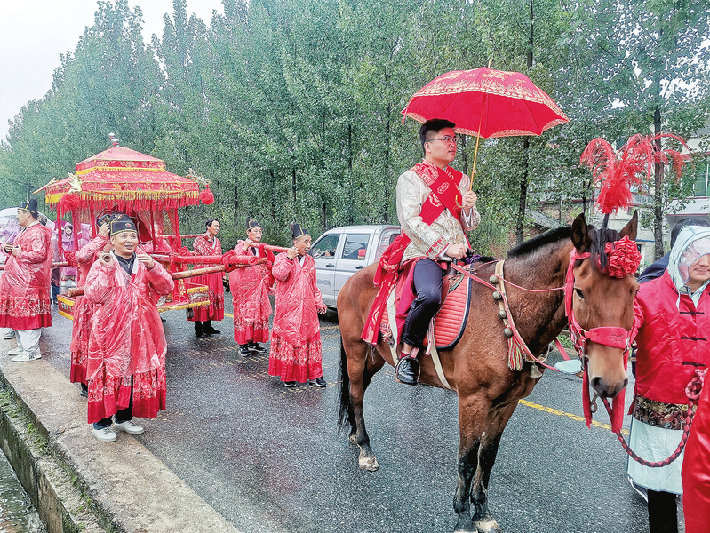 锣鼓队、迎亲牌、五花马、八抬大花轿……10月1日,在蒙蒙细雨中,洛南县景村镇景村街社区的一户人家举行了一场别样的传统仿古婚礼。婚礼全面体现“喜庆祥和、节俭绿色、教化育人、弘扬新风”的理念,采用更加符合年轻人审美的布景、着装,美而不奢、简而不陋”,以“新婚礼”弘扬“新风尚”,让婚俗改革更加具体化、亲民化。 (本报通讯员 郭夏季 摄)
