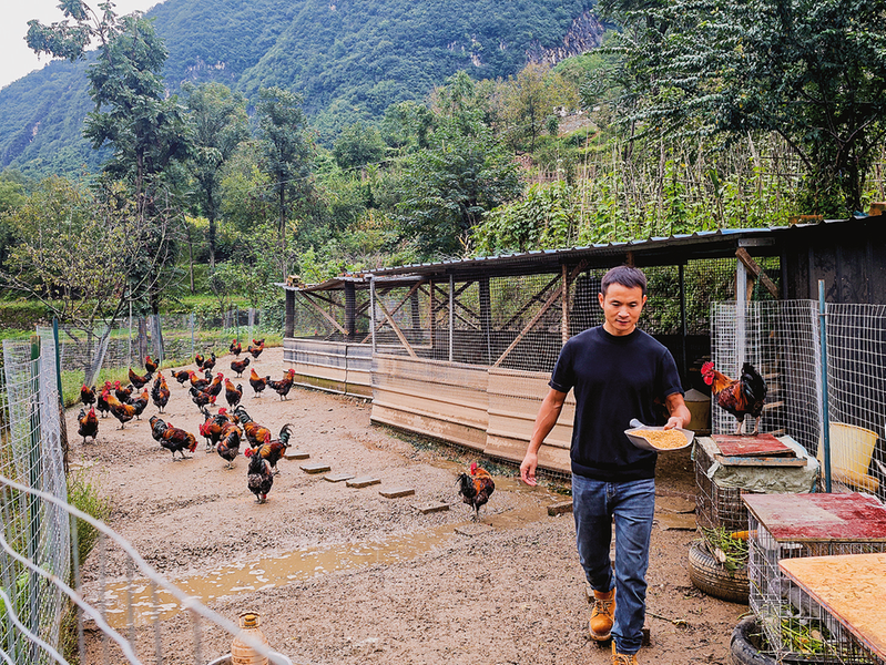 畜牧业是镇安县农业经济的重要支柱。在永乐镇青槐社区,今年38岁的张永涛正在修缮自家房屋,旁边的几座鸡舍里,4000多只鸡“叽叽喳喳”叫个不停。