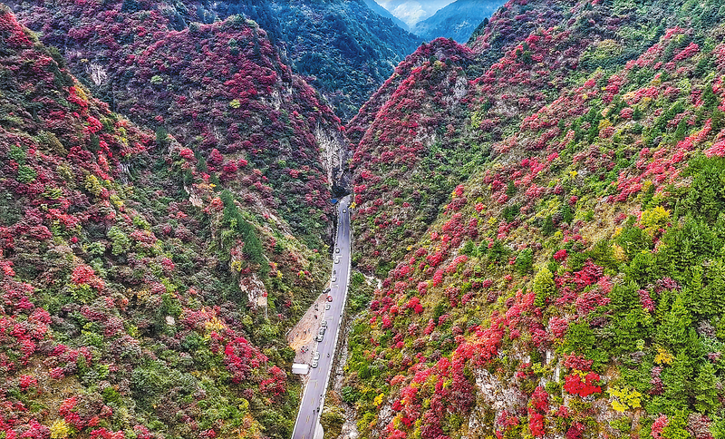 金秋时节,秦岭红叶即将进入最佳观赏期。十月十五日,位于312国道商州区牧护关镇峡口段的山间正悄然披上斑斓彩衣,红叶似火的秋日美景吸引了大批游客驱车前往观赏。 (本报记者 杨 鑫 摄)