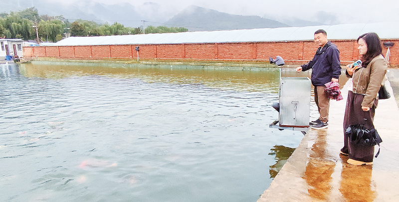 10月11日,孙明(左)在给锦鲤喂食。“妈妈快看!大红鱼跳出水面了!”一个小女孩高兴地对她妈妈喊道。10月11日,在位于丹凤县棣花镇万湾社区的丹凤县富苑华生态园有限公司鱼塘边,游客们围着鱼塘,一边欣赏锦鲤,一边拍照。鱼塘里的锦鲤欢快地游来游去,有红色的、黄色的和彩色的,色彩斑斓,令人赏心悦目。鱼儿还不时跃出水面,似与游人相乐。惊鸿一瞬,溅起一片水花,孩子们见了,禁不住欢呼雀跃。生态园里,到处一片欢声笑语。