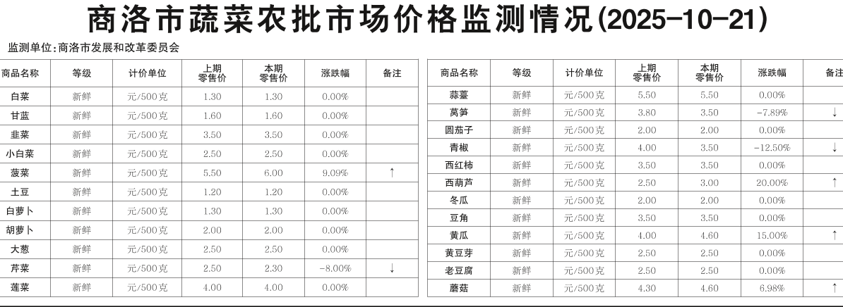 商洛市蔬菜农批市场价格监测情况(2025-10-21)