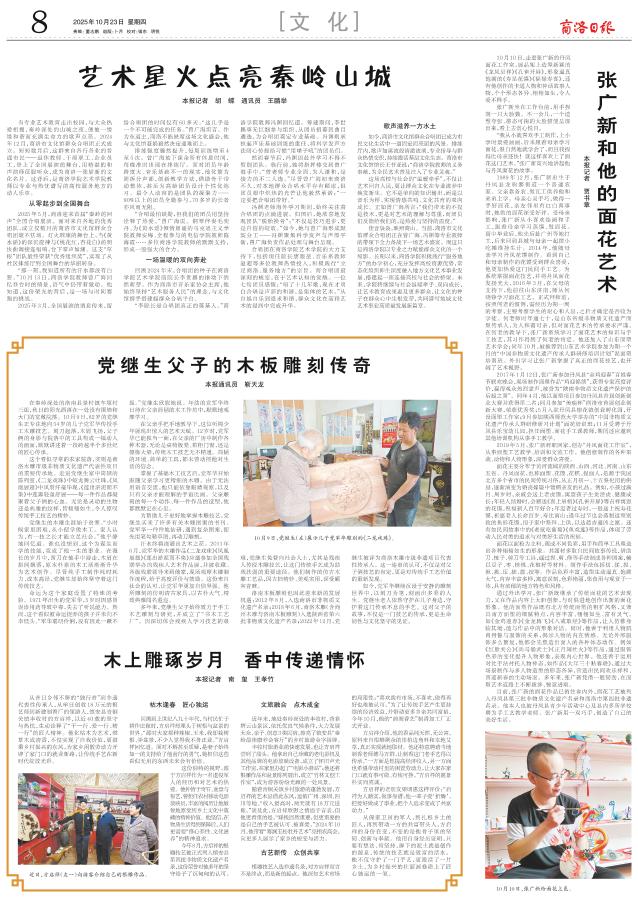 洛南木板雕刻也因此迎来新的发展机遇:2012年8月,入选商洛市非物质文化遗产名录;2018年6月,商洛木雕(含商州木雕与洛南木板雕刻)入选陕西省第六批非物质文化遗产名录;2022年12月,党继生被评为商洛木雕市级非遗项目代表性传承人。这一连串的认可,不仅是对父子俩技艺的肯定,更是对传统手工艺价值的重新发现。