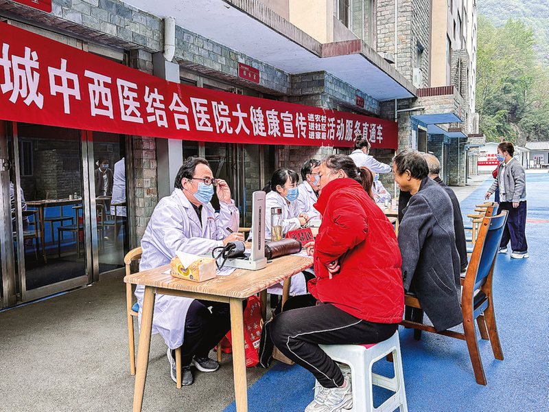 10月23日,镇安县慈善协会联合县老龄事业服务中心、县房管中心,在滨河佳园保障房小区开展重阳节慈善志愿服务活动。通过义诊、理发、慰问表彰等形式,为社区老人送去温暖与关怀。图为医务人员正在为老人义诊。 (本报记者 刘佳乐 摄)