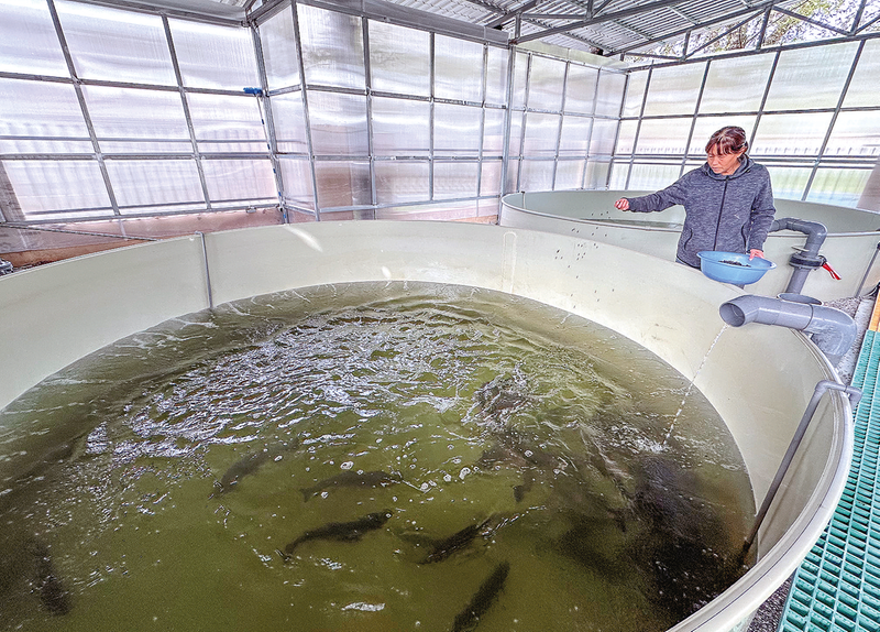 走出民宿区,顺着村路往前走,很快就能看到七星村的特色产业——七星村家庭版冷水鱼养殖示范项目。封闭式的大棚内,安置着4个直径5米的圆形养鱼池,分别养着虹鳟和鲟鱼两种冷水鱼。60岁的技术人员刘巧利正在给鱼喂食:“我每天来给鱼喂食、消毒等。基本上这里的鱼都是供给村里的农家乐了。”