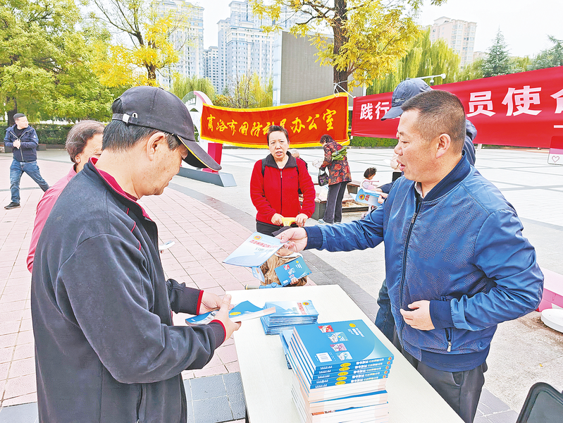 10月31日,市国防动员办公室在市区江南小区广场开展庆祝新中国人民防空创立75周年活动,向市民普及国防动员相关法律法规和人民防空、防空警报、防灾减灾等知识。(本报记者 李 敏 摄)