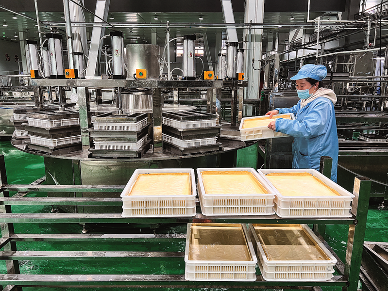 产业链的延伸让价值不断提升。洛南县探索“政校企”“政企企”协同创新模式,联合西北农林科技大学等合作平台,联合研发出豆乳、豆蛋白等20多个新品,推动豆腐从初级产品向精深加工迈进。“别小看一块豆腐,学问大得很!靠着这些新模式,我们这几年研发出了10多种产品。”王振书拿起一包小豆干介绍,“这是我们的爆款,销往南京、上海等地,价格是鲜豆腐的6倍。”