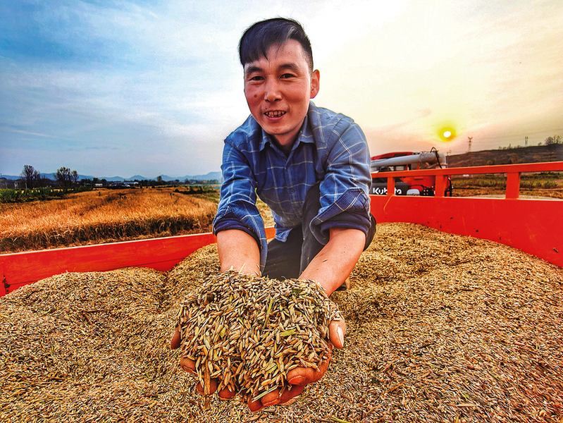 宋树红驾驶收割机,开足马力作业,确保稻谷颗粒归仓。
