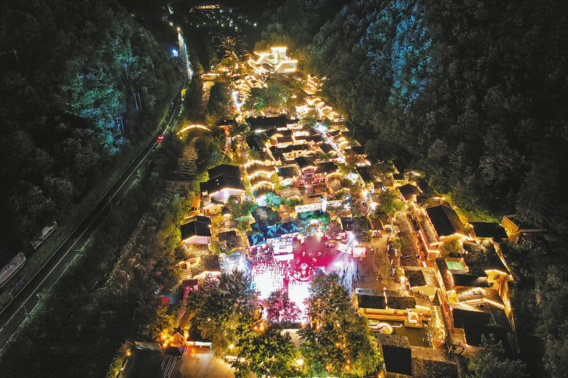 金秋时节,柞水终南山寨景区景色宜人,吸引众多游客前来打卡游玩,于喧闹中透出蓬勃的生机活力。图为景区夜景,从高处看去灯火辉煌,仿佛置身童话世界。 (本报记者 李小龙 摄)