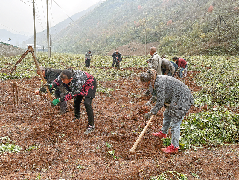 本报讯 (记者 胡 蝶)11月5日一大早,商南县青山镇马蹄店村部分村民在党员干部的带领下,来到蜜薯基地挖蜜薯。