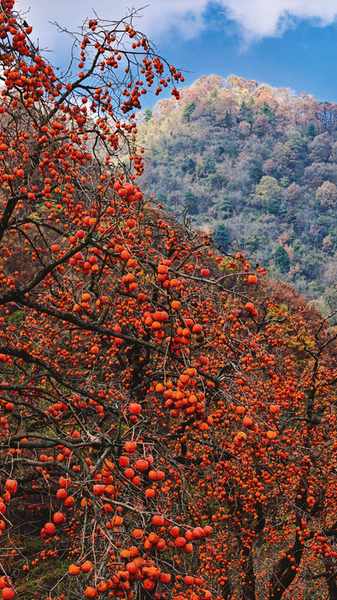 商州区杨斜镇的柿子树上,有商洛秋天最亮眼的一抹红。枝头挂满了橙红的柿子,像一盏盏小灯笼,在蓝天白云的映衬下,与远处的山峦构成一幅绝美的田园风光画。
