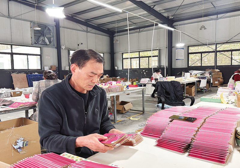▷青山镇社区工厂带动100多人稳定就业。图为工人李陆林整理贺卡。