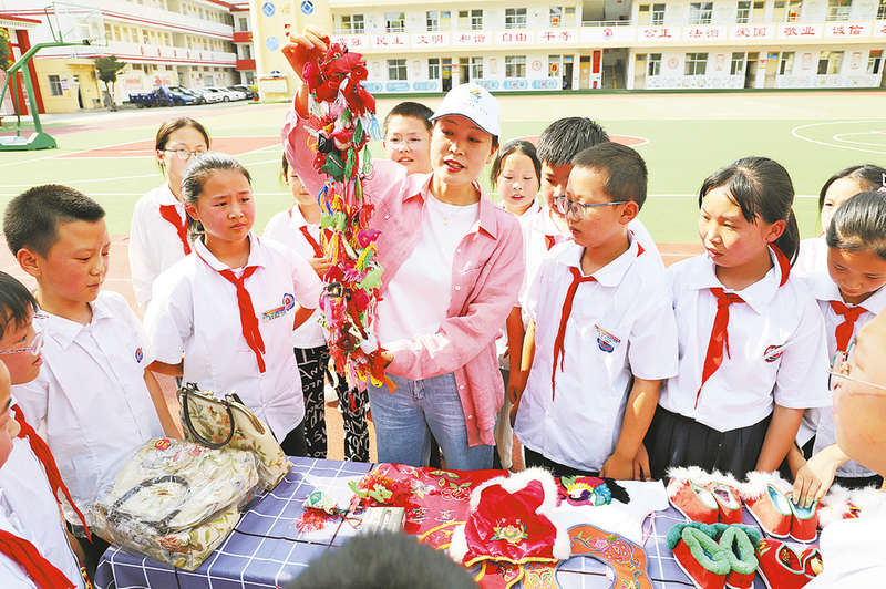 △“非遗进校园”走进试马镇中心小学,商南县文化馆工作人员为学生介绍商南非遗手工香包。(商南县文化馆供图)