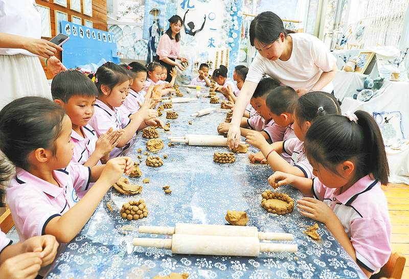 ▷“非遗进校园”活动中,文化志愿者为雅都幼儿园小朋友现场教授商南泥塑制作技艺。(商南县文化馆供图)