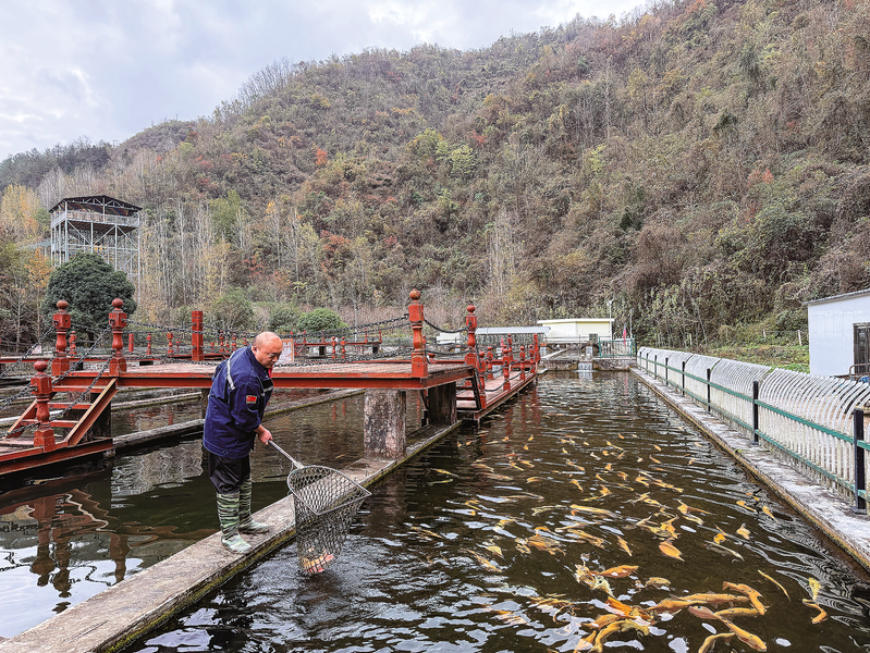 11月10日,商南县金丝峡镇太子坪村王家坡冷水鱼观光垂钓园内,工作人员正在为客户捕捞预定的金鳟鱼。该园依托当地优质冷水资源,大力发展特色养殖,年产中华鲟、虹鳟、金鳟、娃娃鱼等高品质冷水鱼300多吨,有效带动了村集体经济增长和周边群众就业增收。 (本报记者 刘佳乐 摄)