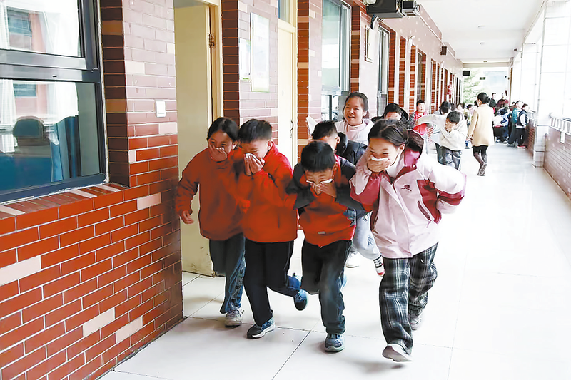 ◁为强化全校师生消防安全意识,11月12日,山阳县第三小学开展实战化消防应急疏散演练,全体师生闻令而动、规范操作,演练全程高效有序。 (本报记者 张 英 摄)