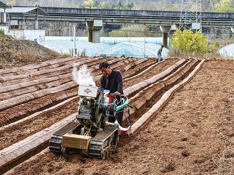 11月12日,商州区板桥镇下湾村的草莓基地里,农户正在翻地备耕试种草莓新品种。近年来,下湾村锚定生态农业方向,做强特色产业,让田间地头孕育增收新希望。(本报记者 谢 非 摄)