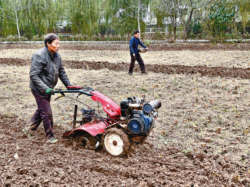 11月19日,在商州区三岔河镇闫坪村稻虾共生休闲露营地内,工作人员一边使用小型旋耕机翻地,一边播撒黑小麦种子。据了解,该基地在水稻收割结束后引进“药食同源”谷物黑小麦,计划种植30多亩,可带动周边10多名群众实现家门口务工增收。 (本报记者 王孝竹 摄)