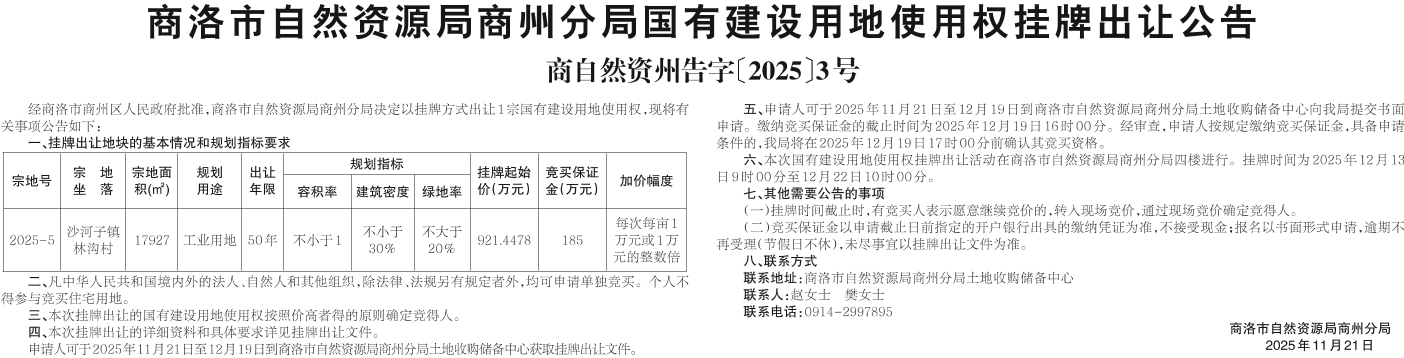 商洛市自然资源局商州分局国有建设用地使用权挂牌出让公告