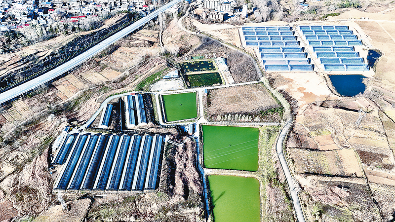 洛南县生态农业放心菜示范园项目(刘涧社区)已建成智慧化温室大棚16座,棚内种植蔬菜以西红柿、黄瓜为主,近期已陆续上市,可有效保障冬季蔬菜供应。图为11月20日,航拍洛南县生态农业放心菜示范园项目(刘涧社区)全景。 (本报记者 杨 鑫 摄)