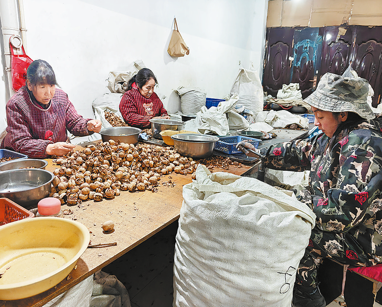 近日,洛南县保安镇仓圣社区的正源核桃农民专业合作社内,工人们正熟练地对核桃进行剥壳分拣。该合作社立足本地丰富优质的核桃资源,吸纳周边60多名群众就近务工,让核桃成为群众增收的致富果。 (本报记者 马 姜 摄)