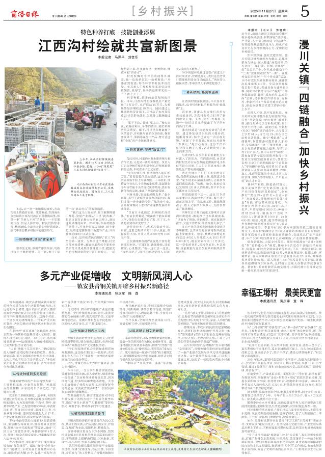 延伸产业链,推进强村富民。漫川关镇坚持“党支部引领、主导产业与集体经济双轮驱动”,全面推行“党支部+合作社+企业+农户”发展模式,持续增强村集体“造血”功能,带动群众稳定增收。今年新扩种茶叶850亩,辐射125户农户,户均年增收3000元;种植中药材2541亩,覆盖农户 2262户6232人;新增油茶1000亩、油菜600亩,核桃、板栗、魔芋等传统特色作物种植规模也稳步扩大,形成多元种植格局。李家坪村200平方米蛋鸽养殖二期项目顺利完工,乔家村集体经济2000只散养鸡养殖项目有序推进,预计年底出栏;贺家岭农旅康养融合、毛绒玩具厂生产线扩建、年产3000吨白酒项目已启动实施,产业链条持续延伸。