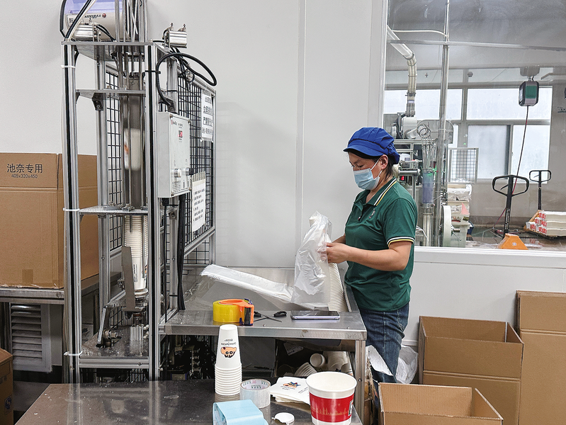 12月1日,走进陕西东勋新材科技实业有限公司生产车间,工人正熟练地操作着设备,有条不紊地进行着纸杯生产。该公司主要生产可降解纸质容器、餐饮包装、药品包装等产品,项目全面建成后预计年产值2.3亿元,带动就业200多人。 (本报记者 杨 萌 摄)
