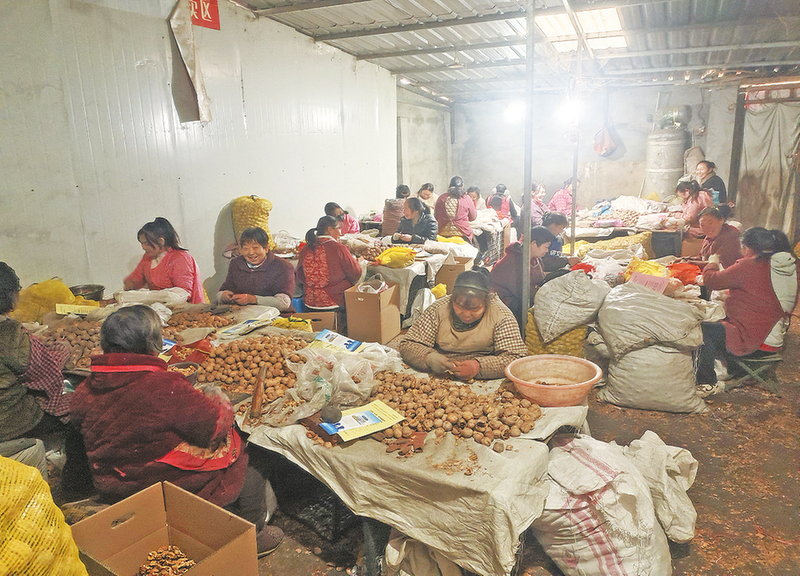 12月2日,丹凤县铁峪铺镇中心村一处核桃加工作坊内,务工群众正在加工核桃仁。据悉,该加工作坊由本地客商李树廉创办,带动周边20多名群众就近务工,每人每天收入40元至60元不等。 (本报通讯员 田 东 摄)