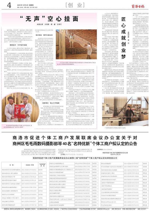 商洛市促进个体工商户发展联席会议办公室关于对商州区毛毛雨数码摄影部等40名“名特优新”个体工商户拟认定的公告