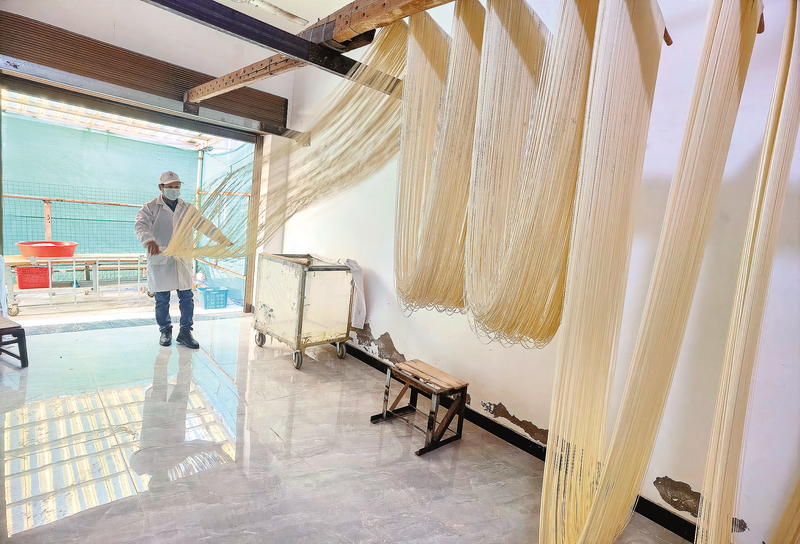 上午八九点钟,当日光变得温润,冯新瑞便将醒好、盘好面条的面筷插上数米高的面架。“温度到16℃,湿度在60%左右时,面条的发酵最是恰到好处,能拉出细如发丝而不断的挂面。”说话间,只见他手执长长的面筷,在垂落的面束间一拨、一拉,长长的银丝倾泻而出,在阳光下泛着光芒。这“面瀑”不仅是美味,更是一件“非遗艺术品”。
