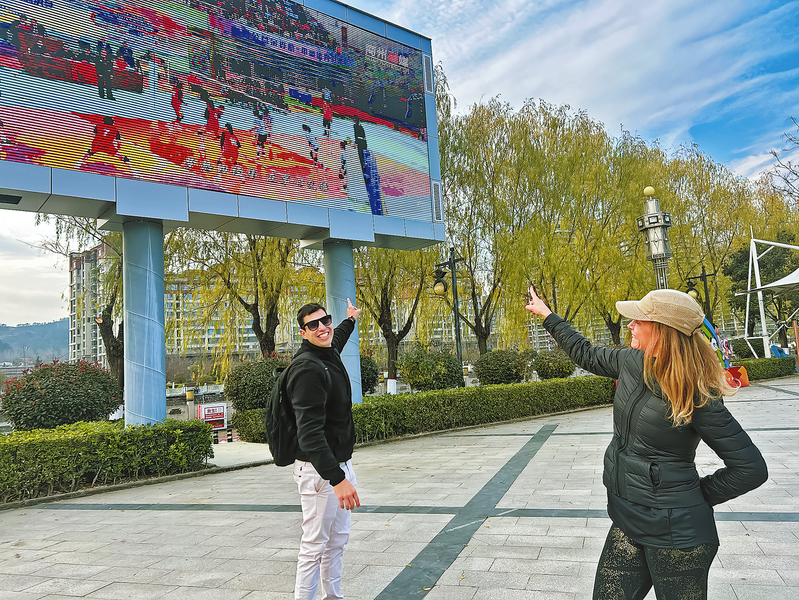 十二月八日,我市丹鹤楼广场电子大屏上播放的U15世界中学生排球锦标赛宣传视频,引起了几位外国友人的关注。近日,我市通过报纸、电视、网络、户外大屏等各类平台宣传赛事,不断擦亮“赛事之城”新名片。(本报记者 肖云 摄)