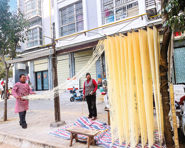 12月10日,丹凤县竹林关镇搬迁群众在江北移民新区拉扯挂面,太阳下晾晒的挂面成为一道亮丽的风景线。据了解,竹林关镇鼓励群众自主创业,发展挂面、粉条等手工作坊,仅挂面年销售额200万元以上。 (本报通讯员 王 蒙 摄)