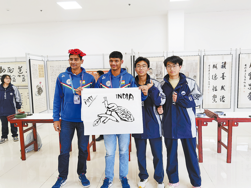 △12月9日,印度队员走进商洛中学,用毛笔画下印度国鸟——蓝孔雀,定格中外少年的暖心情谊。 (本报记者 景 康 摄)