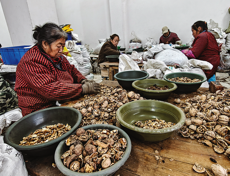 12月11日,在洛南县城关街道东街社区的核桃加工点,群众正在剥核桃仁。据了解,该加工点每天用工约50人,人均日收入50至60元。 (本报记者 米子扬 摄)