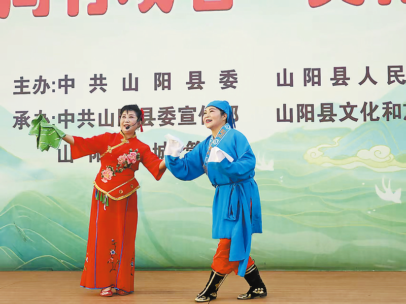 ▷艺术团成员在山阳县委举办的文化活动中表演《夫妻观灯》。在山阳县十里铺街道高一社区,一位有着20多年党龄的农村党员,用数年如一日的坚持与奉献,带领一群平均年龄55岁的乡村妇女,从锅台灶边走到聚光灯下,将星星文化火种汇聚成光,书写了一段温暖而充满力量的基层文化实践故事。她,就是十里铺街道中老年艺术团团长曹淑娥。