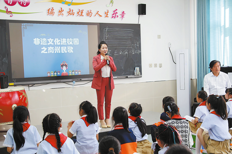 在“非遗文化进校园”主题活动中,李英莉为商州区第六小学的学生讲述商州民歌相关知识,并教孩子们学唱《号子歌》《石榴娃烧火》等曲目。“南山岭上南山坡,南山坡上唱山歌,唱得红花朵朵开,唱得果树长满坡……”这首创作于20世纪50年代末的商州民歌《唱得幸福落满坡》,不仅唱出了当时商州农村的新气象,更承载着一代又一代商州人对美好生活的向往。如今半个多世纪过去,歌里的“幸福”早已从憧憬变为现实,以其为代表的商州民歌也在传承中迎来了新的生机——2025年3月25日,商州民歌正式列入商洛市第六批非物质文化遗产名录,这朵绽放在秦岭深处的艺术之花,正迎来新的生机。