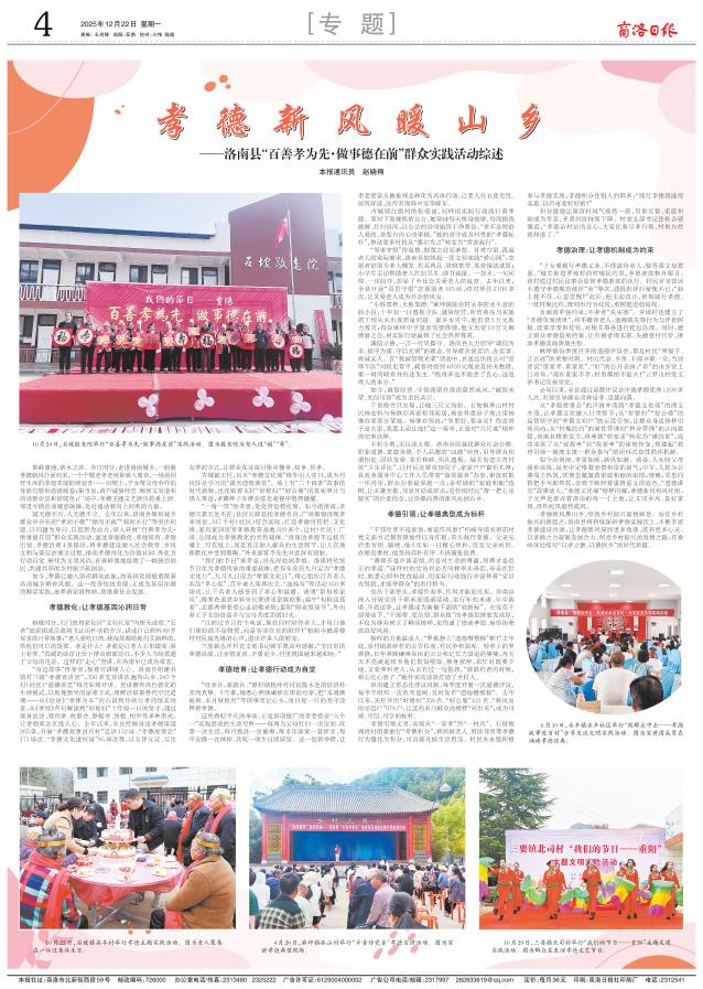 国无德不兴,人无德不立。去年以来,洛南县聚焦城乡群众中存在的“孝而不敬”“德而不践”“知而不行”等突出问题,以问题为导向、以创新为动力,深入开展“百善孝为先·做事德在前”群众实践活动,通过孝德教化、孝德培育、孝德引领、孝德治理4条路径,将孝德建设融入社会教育、乡风文明与基层治理全过程,推动孝德内化为价值认同、外化为行动自觉、转化为文明风尚,在秦岭腹地绘就了一幅德治润民、共建共享的乡村振兴新图景。