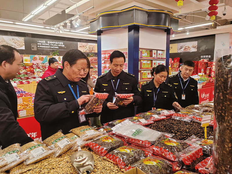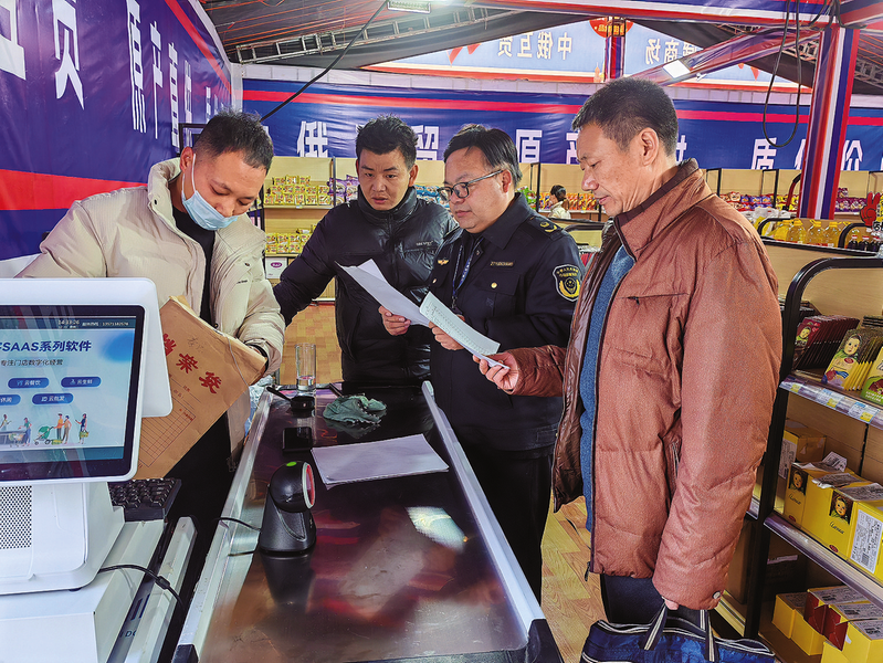 ◁2025年1月26日,执法人员开展春节市场秩序执法检查。