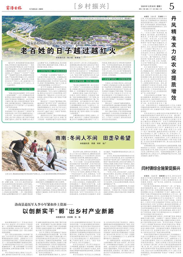 本报讯 (通讯员 郭乾琪)近年来,商州区闫村镇紧扣乡村振兴战略部署,聚焦特色产业培育、乡村治理创新、人居环境提升三大核心领域精准发力、综合施策,绘就出一幅产业兴旺、治理有效、生态宜居的乡村振兴新图景。