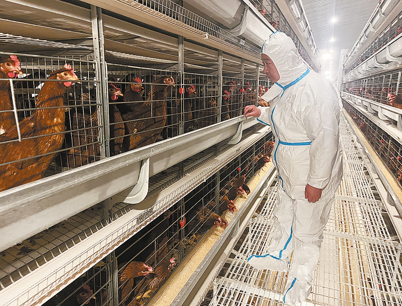 近日,在商南县城关街道郭家村南凰凤禽农业科技有限公司的养殖基地,技术人员正在对鸡舍进行日常检查。据悉,该公司养殖蛋鸡10万只,日均产蛋4.5吨,鸡蛋畅销咸阳、西峡等地,带动当地特色养殖产业稳步发展。(本报记者 南 玺 摄)