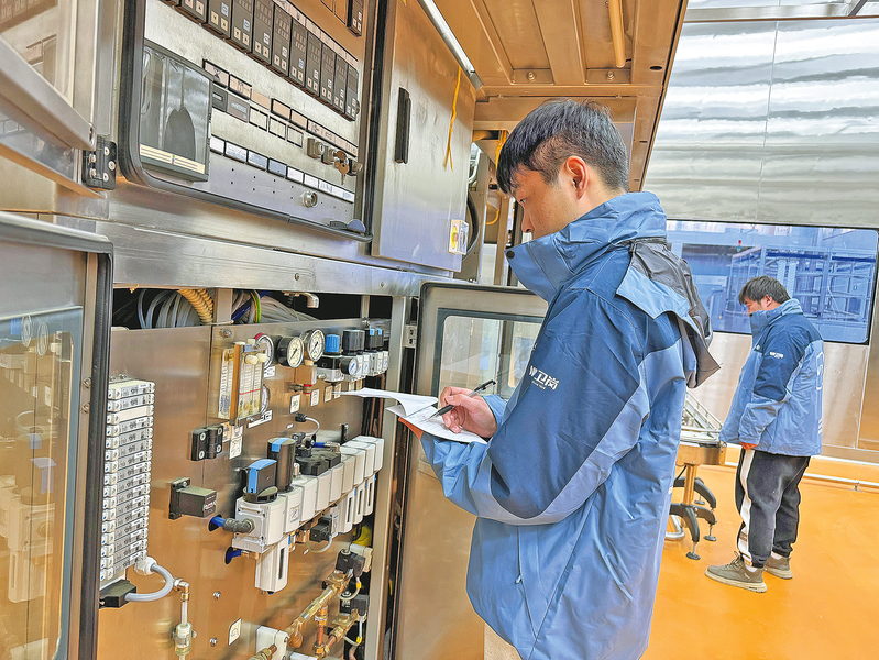 1月12日,在洛南县宁洛产业示范园的卫岗乳业绿色生态循环奶牛产业示范园二期项目现场,技术员尚佳帆正在检查设备运行状况。作为苏陕协作重点工程,该项目引入数字技术和智慧化管理体系,实现了从鲜奶无菌储运、乳品加工到销售全程的质量管控闭环。 (本报记者 方 方 摄)