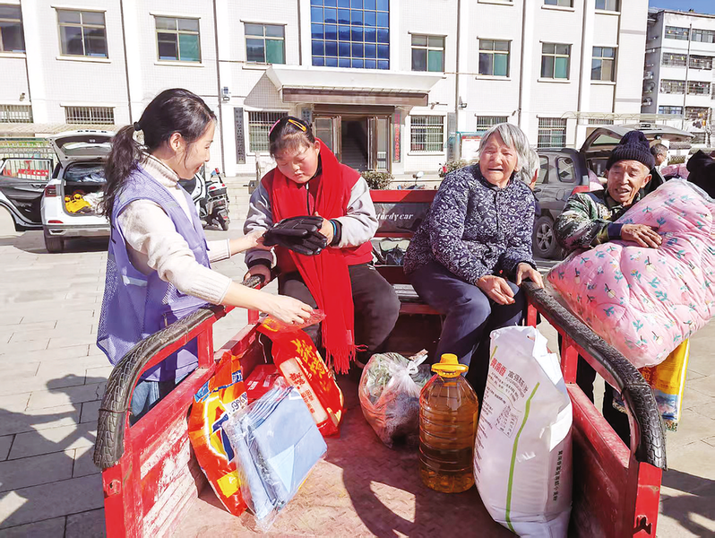 1月13日,洛南县保安镇仓圣社区“四支队伍”携手陕西慧灵社会工作服务中心及洛南县残联,共同开展“走千家、进万户、访民情、送温暖”助残暖冬慰问活动,为20户残疾人家庭送去棉被、米面油等生活用品。 (本报记者 肖 云 摄)