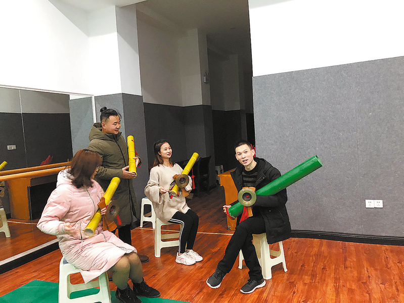 △1月6日,陈佩(右一)在镇安县剧团排练厅里手把手指导青年学员。