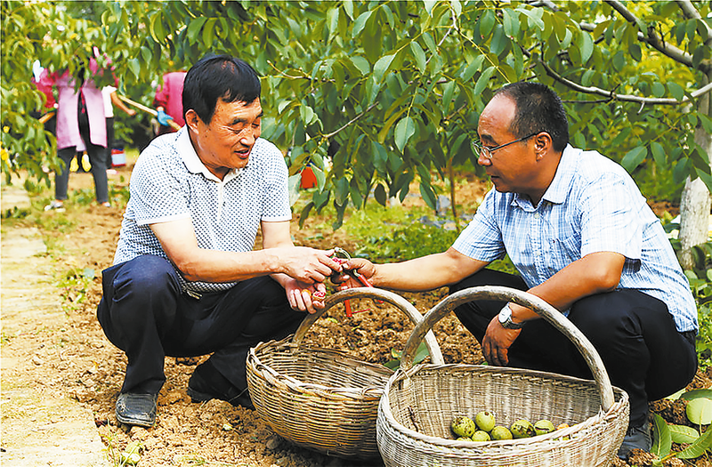王根宪(左一)在洛南县红仁核桃种植园了解核桃仁品质情况。 (资料图片)本报记者 朱良娜