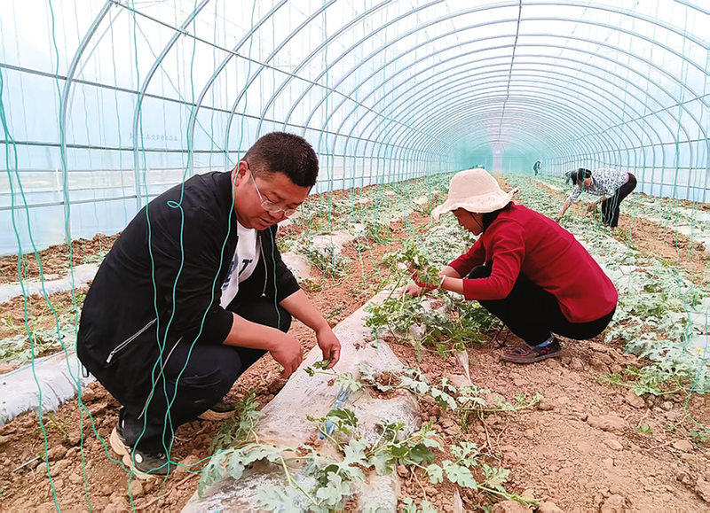 2025年4月,李江洪(左)在产业园给西瓜打蔓、整枝。