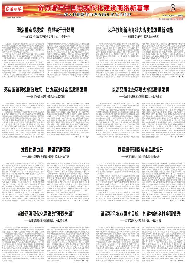 李剑文表示,2026年,全市生态环境系统将认真学习贯彻市委五届九次全会精神,锚定“十五五”目标蓝图,坚定不移沿着生态文明建设之路前行,奋力书写商洛生态文明建设的新篇章。具体从3个方面重点发力。一是深入推进污染防治攻坚。持续开展大气污染治理专项行动,确保中心城区空气质量持续保持全省领先。强化水污染防治,加强入河排污口整治和集中式饮用水水源保护区规范化建设,确保主要河流水质稳定达标。二是持续提升环境治理水平。推进生态环境损害赔偿制度改革,规范涉企执法和环境信访调处。严把项目准入关,做好全市重点项目环评审批服务工作。认真做好第三轮中央环保督察反馈问题整改,持续打好环保问题整改硬仗。开展丹江汛期环境安全保障应急监测演练,持续优化“库库联动”应急工作机制,加大环境风险隐患排查力度确保环境安全。三是加快推动绿色低碳发展。一体推进美丽城市、美丽乡村、美丽河湖等“美丽系列”建设,推动美丽商洛建设取得较大进展。不断深化减污降碳,持续推进国家气候适应型城市试点建设,完成火电、水泥等重点行业企业全国碳市场碳配额清缴履约工作。 (本报记者 贾书章)