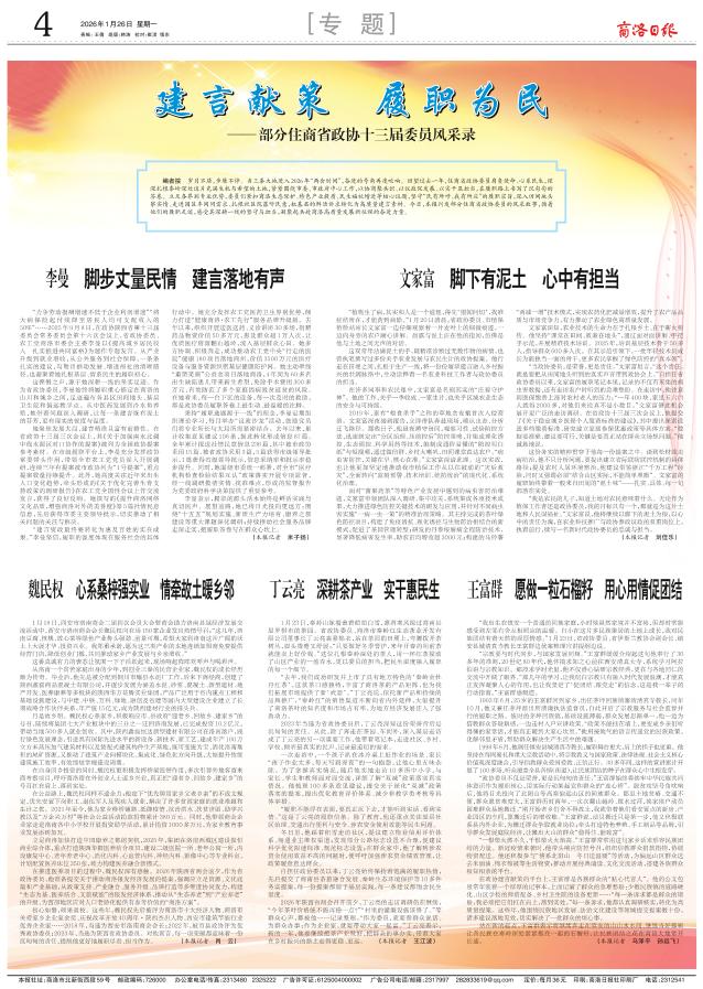 编者按 岁月不居,步履不停。当三秦大地进入2026年“两会时间”,奋进的号角再度吹响。回望过去一年,住商省政协委员肩负使命、心系民生,深深扎根秦岭深处这片充满生机与希望的土地,紧紧围绕市委、市政府中心工作,以协商聚共识、以议政促发展、以实干显担当,在履职路上书写了沉甸甸的答卷。立足各界别专业优势,委员们紧扣商洛生态保护、特色产业提质、民生福祉增进等核心议题,坚守“民有所呼、我有所应”的履职宗旨,深入田间地头察实情、走进园区车间问需求、扎根社区院落听民意,把基层的鲜活诉求转化为高质量建言素材。今日,本报刊发部分住商省政协委员的风采故事,循着他们的履职足迹,感受其深耕一线的坚守与担当,凝聚起共赴商洛高质量发展新征程的奋进力量。