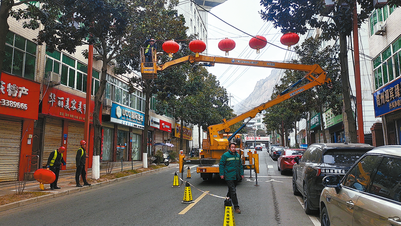 1月28日,为营造喜庆热闹的节日氛围,丹凤县精准选址布局,组织工作人员在县城多条主次干道及城市重要节点悬挂大红灯笼,将城区装点得暖意融融。 (本报通讯员 樊利仁 摄)