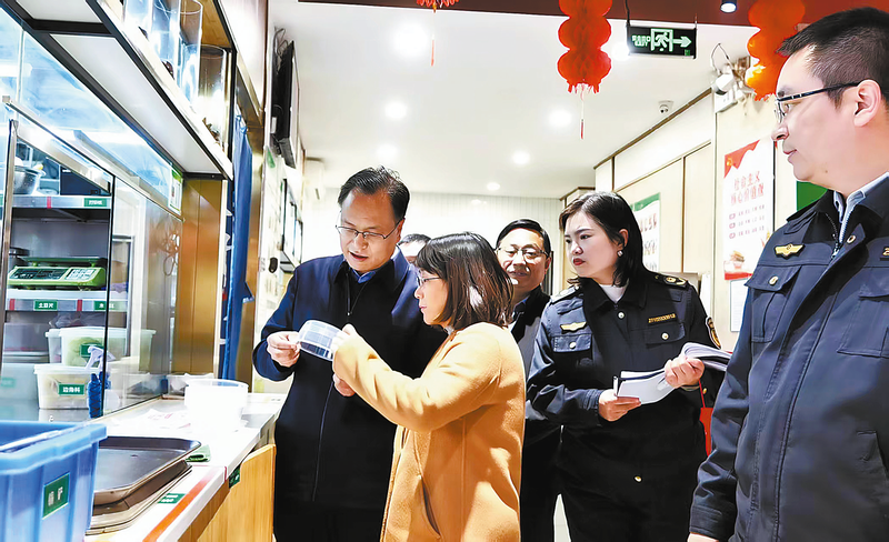 ◁市市场监管局党组书记、局长朱雪彬(左一)深入各县区督导调研餐饮服务质量提升暨限塑共治工作。